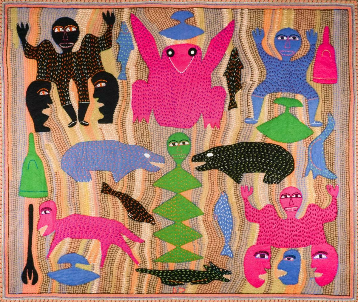 Showcasing 18 works in felt, embroidery, and beadwork, this exhibition celebrates the remarkable skill and creativity of women textile artists across Nunavut. The pioneering women who first defined the art of wall hangings often had little to no formal training, instead learning from one another. Artists often invented techniques as needed and even developed recognizable “signature” stitches that became uniquely their own. Each artist has developed a distinctive voice, not only in subject matter and composition, but in the very stitches that shape the work.