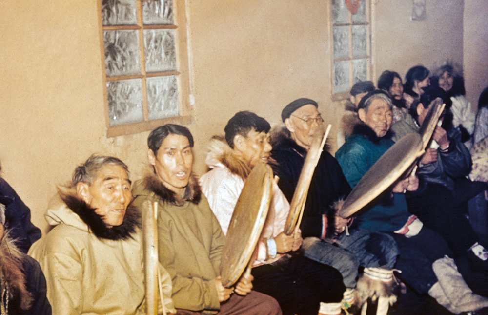 Drum dance in Akłarvik in 1950. Harry Inukiktluk, the author’s grandfather, is pictured in the blue parka fifth from the left© NWT ARCHIVES/MCCALL FAMILY / N-2002-022: 0046