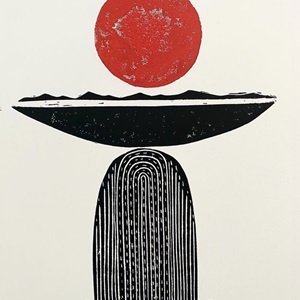 Under the guidance of Kuujjaq, Nunavik, QC-based artist Niap, Allakariallak started exploring linocut printmaking and painting. Her graphic works mirror her jewellery design in their mostly monochromatic colour scheme and repetition of geometric forms. In her 2021 print Qulliq Ikummattuq, a stone lamp is delicately balanced between a pedestal and red sun, echoing the voluptuous form of a woman found in previous works by the artist. “Some of my favourite things to express in my artwork would be the revitalization of traditional Inuit tattoos, my personal experience with motherhood—reflections of how bodies are changing through this experience, and reconnecting with and exploring new ideas based on traditional tools,” Allakariallak states.