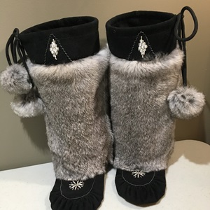 Rideout has been sewing for years. Her mom, Vera Best and grandmother Dulcie Montague and Aunt Jane Gear were her biggest influences in the sewing world. She grew up seeing her mother and grandmother constantly making duffle coats, moose hide and duffle slippers, mukluks and moose hide mitts, canvass coats and knitting a wide variety of items. Rideout started sewing at about the age of 10 with hand sewing little things like throw pillows with people’s names on them. When her own children were small she started knitting and crocheting, then, as her children grew, so did her interest in the traditional crafts. She became interested in slipper making and from there, traditional native mukluks, gauntlets, cuffs and leather/fur hats. Rideout has developed and uses her own pattern when making her mukluks and leather hats.