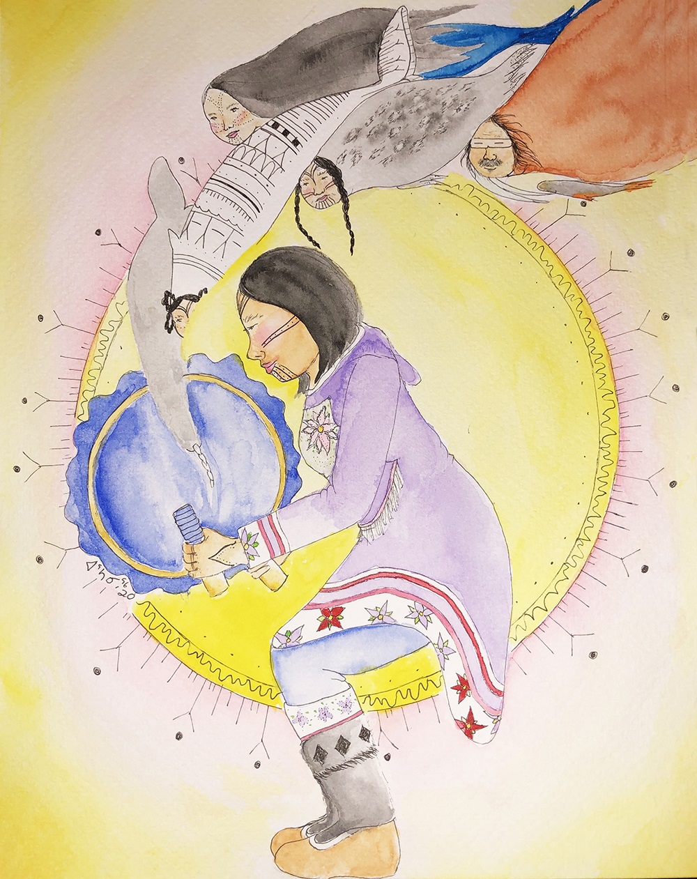 Currently based in Montreal, QC, Arsaniq Deer is a traditional tattoo artist, painter and illustrator from Quaqtaq, Nunavik, QC. Surrounded since birth by an artistic family, creativity was always fostered and encouraged and depictions of Inuit women, myths and legends remain favourites of Deer. “My mom used to help me in painting and drawing for my school projects. That’s sort of how I started out.” [1] Experimenting first with acrylics and now with watercolours, Deer is now collaborating with her mother, illustrating her children’s story “Juutani”. Along with collaborating on a book, Deer performed her very first tattoo on her mother. “It was an honour”, [1] remarked Deer.