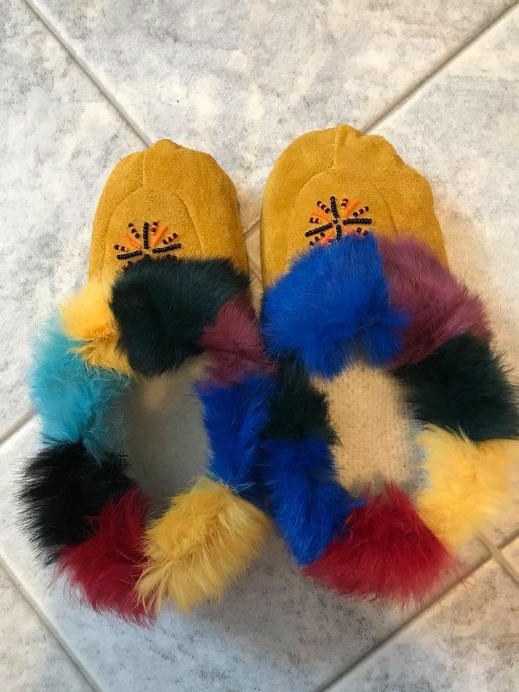 She works with a variety of materials such as moose-hide, sealskin, locally harvested grasses, wool, leather, felt, and crochet yarns. She makes a variety of beautiful crafts from moose-hide and sealskin slippers, grasswork, crocheted and knitted cloths and clothing, to Inuit dolls adorned in beadwork. Though Rigolet has a craft store where she can get many of her materials, Gertrude likes to collect her grass from the land and dry it out herself, and occasionally travels to Goose Bay where she has access to more materials for her work.
