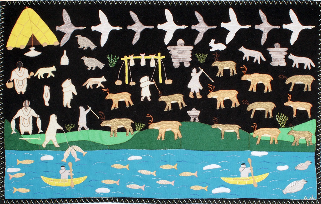 Putumiraqtuq began creating wallhangings at age twelve under the guidance of her mother Winnie Tatja, a well-known wallhanging artist in her own right. She is “my lifelong mentor” says Putumiraqtuq, crediting her mother with her early interest in the art form and an enduring influence on the work she creates to this day, both in her stitchwork and the subject matter she chooses to portray. “While we were sewing together, my mother would tell stories about culture and traditions and the life they lived. As I learned to sew and understand the reasons, she made her designs connected to her experiences,” Putumiraqtuq says. “I keep her legacy to keep our culture and traditions alive and pass them on to the future generations.” [1]