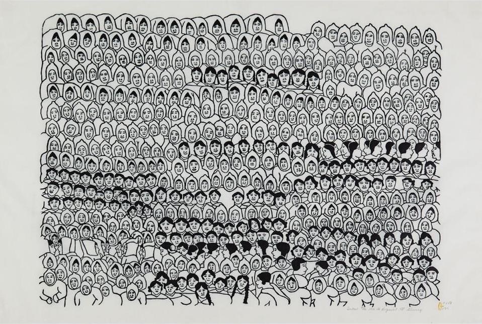 Kigusiuq’s practice is primarily in drawing and printmaking. Her visual language explores the experiences of her early life, depicting life on the land and camp life with an emphasis on community [2]. Her drawings include images of winter camps, travel by dogsled, drum celebrations and daily activities, all of which she depicts with a playful hand [3]. Kigusiuq's compositions are primarily completed in black and white. Groups of people gathered are often depicted mid-motion, or large groups of people look to the viewer with expressive faces. allowing the viewer to fully engage with the emotion of the figures.