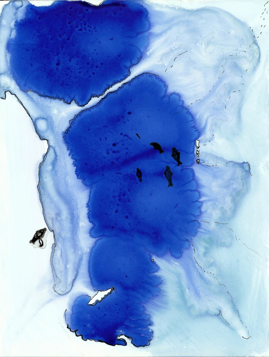 Campbell is also interested in the intersections between aboriginal and non-aboriginal cultures. She is inspired by the complexity of hybrid identities and the tensions that emerge from personal and external definitions of the self. In her practice, she intertwines her knowledge of Inuit and non-Inuit worlds with her personal experiences to produce work the straddles tradition and contemporaneity. Campbell also makes use of ink, oil, stone paper, and digital photography in her works. Feeling constrained by formal stylistic conventions, Campbell began experimenting with the process of inkblot [4]. She drips ink and water on paper or canvas, allowing abstract forms to emerge naturally. Once the surface is dry, she makes images more discernable with the aid of a pen [5]. Campbell describes this process as an attempt, “to turn off my conscious mind and allow my subconscious mind to draw what it sees [6].”