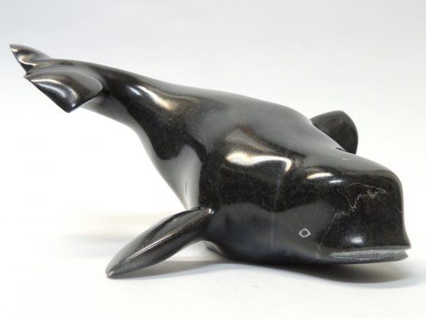 Isaac Oqutaq est un artisan sculpteur originaire de Kinngait (Cape Dorset), au Nunavut. Son père était l’artisan sculpteur Innuki Oqutaq et son oncle était Osuitok Ipeelee, le célèbre sculpteur. Oqutaq est reconnu pour ses sculptures de baleines et d’inukshuks. Cette Baleine, par exemple, représente son approche souple à la forme. La queue élevée et le corps en serpentinite donnent à la baleine l’impression de nager de façon nonchalante. Les autres sculptures de baleine d’Oqutaq représentent la mère et son veau qui nagent généralement ensemble, l’une au-dessus de l’autre. Les formes fluides et sinueuses de ses sculptures rappellent à la fois l’agilité de ces énormes animaux et leur dynamisme dans l’eau. Les œuvres d’Oqutaq ont été exposées partout au Canada, récemment dans le cadre de l’exposition « Small Treasures » à l’Inuit Gallery of Vancouver en 2017.