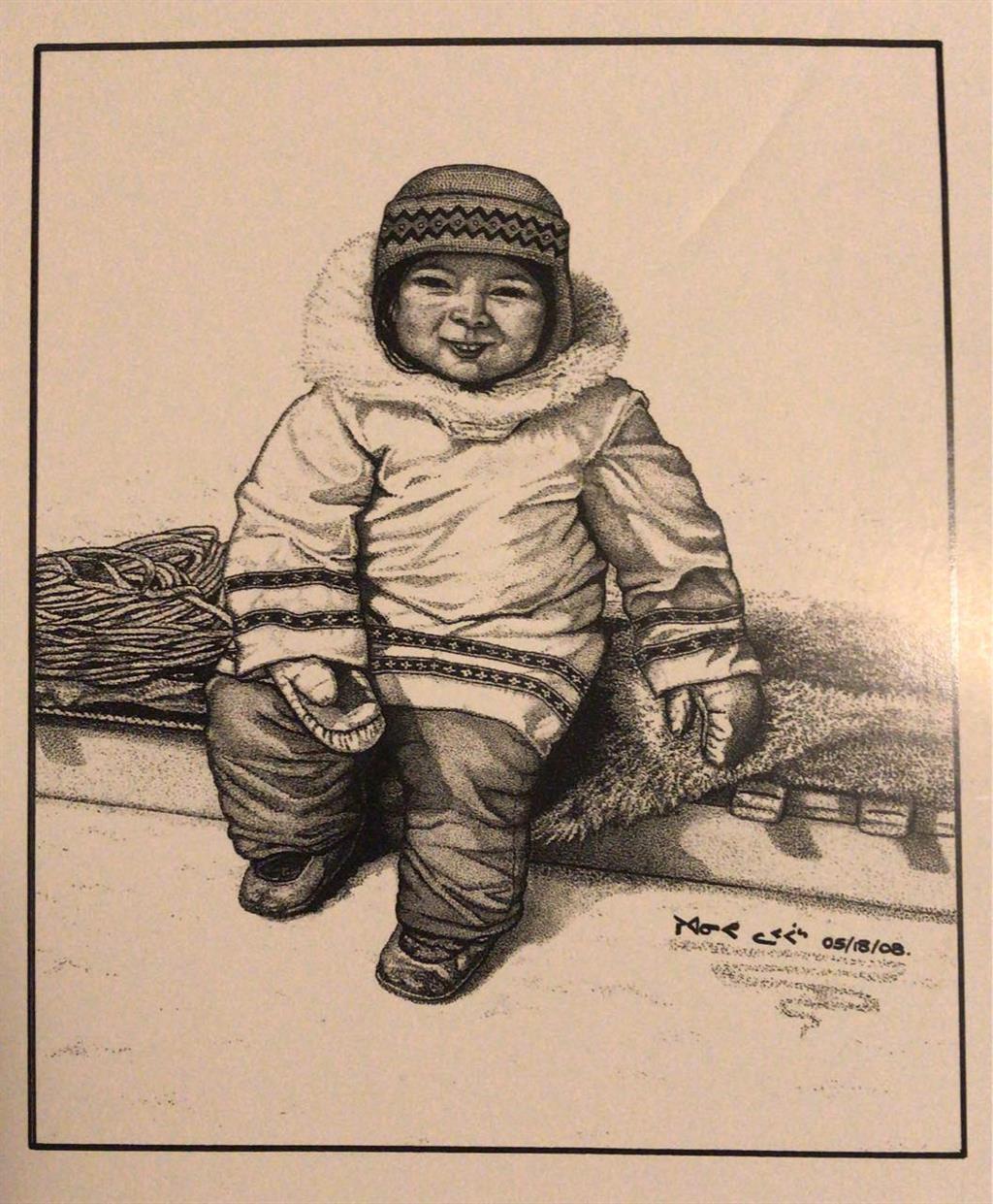 Hailing from Kuujjuaq, Nunavik, QC, Jennifer La Page is a self-taught pointillism artist who creates imagery of people dressed in traditional clothing specific to her region of Nunavik. While sometimes her work is based off of photographs of people she knows or members of her community, the families, fishermen, drum dancers and mothers and babies she gravitates to are entirely from her own imagination.