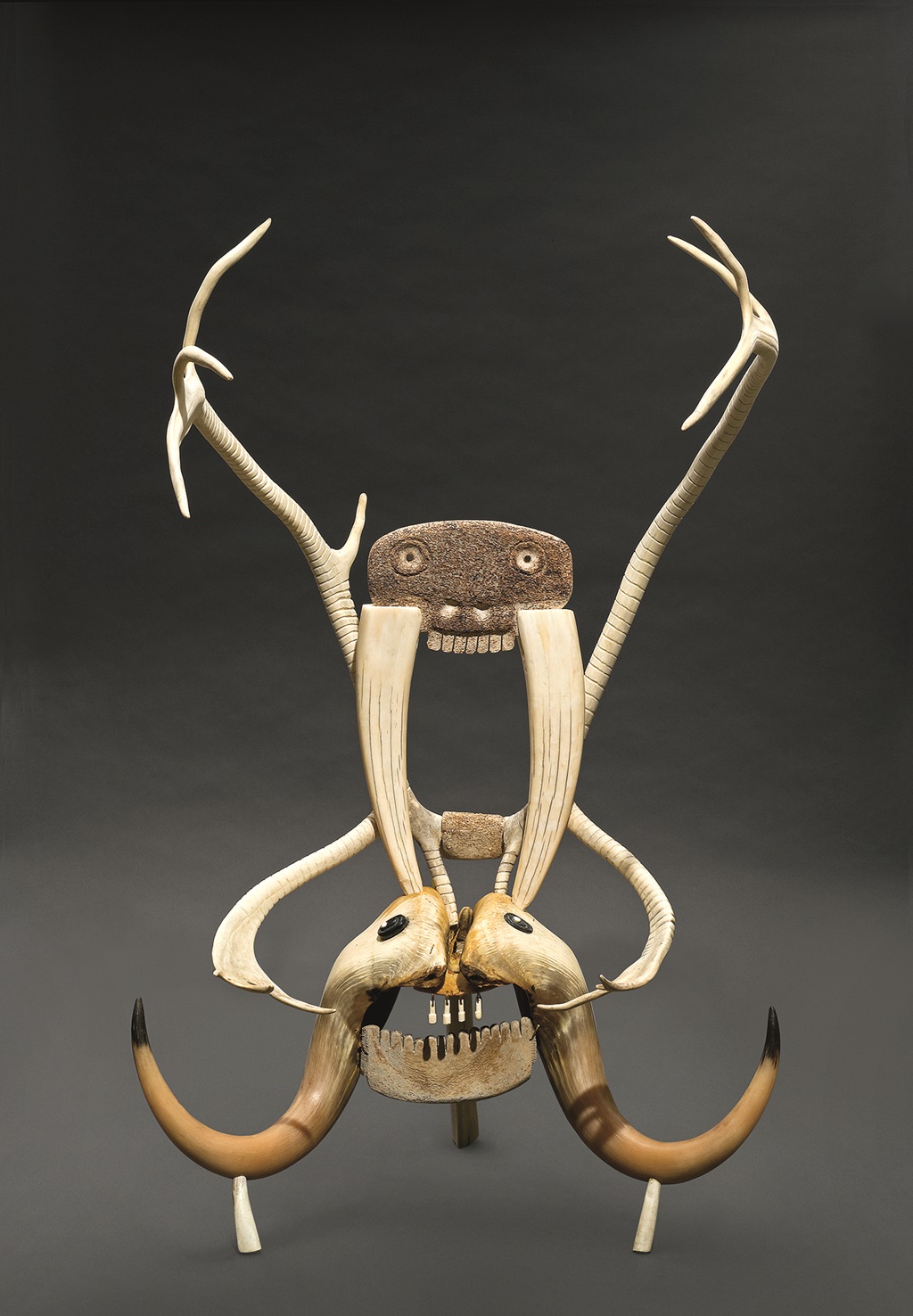 Judas Ullulaq (1937–1999) was an artist originally from Talurjuaq (Taloyoak), NU and later moved to Uqsuqtuuq (Gjoa Haven), NU. Ullulaq is a well-known artist from the Kitikmeot Region of Nunavut whose sculptures incorporated whalebone, ivory, antler, soapstone, muskox horn and sinew. Ullulaq’s two brothers, Nelson Takkiruq and Charlie Ugyuk, as well as his nephew, Karoo Ashevak, were also well-known carvers, whose works influenced one another [1]. In addition to being a well-known artist, Ullulaq is remembered as a respected community leader and known for his great personal warmth, gentleness and humour [2].