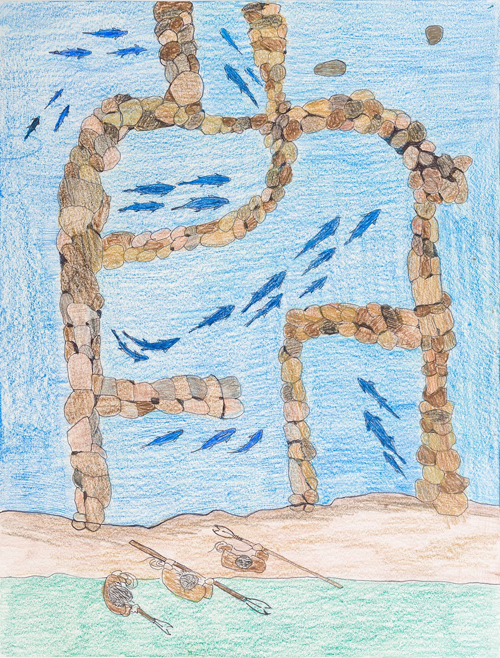 From his teens to his thirties, Etidloi Kagulik worked primarily with sculpture, but after age forty he transitioned to drawing, which is the mainstay of what he produces today. Despite the change in mediums, Etidloi Kagulik’s subject matter has remained consistent: “growing up, I was inspired by the animals and the land around me,” he says, explaining that the natural world and his experiences hunting and living on the land shaped the subjects he depicts in both mediums, such as caribou, polar bears and other wildlife. His pencil crayon work Fishing at Fishing Weir (2024) features a maze-like fishing weir, bounded by rocks whose colours range from chocolate to caramel.