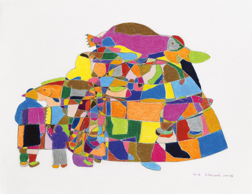 Nick Sikkuark (1943–2013) was a prolific graphic artist, sculptor and painter whose artistic career spanned nearly 50 years. His work is known for its dynamism and grounded in the cultural traditions of the Netsilik. Sikkuark was born in Hanningajuq (Garry Lake), NU, and grew up in Uqsuqtuuq (Gjoa Haven), NU, but travelled widely and lived in Iqaluktuuttiaq (Cambridge Bay), NU; Tikirarjuaq (Whale Cove), NU; Winnipeg, MB; and Ottawa, ON, at various times. He spent the majority of his adult life in Kuugarjuk (Kugaaruk), NU, where he moved in 1968.