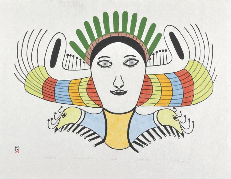 Many of Oshuitoq’s drawings include Inuit women, children and spirits, taken from her imagination as well as from her early life living on the land. Imbuing her subjects with intricate design elements, such as interlocking patterns and numerous dots, she enhances the viewer’s interest and entertains their eye. In Arnakota (1979), Oshuitoq brings the story of the sea goddess Sedna to life through bright colours and symmetric patterns, conveying a sense of movement with strong curvilinear forms.