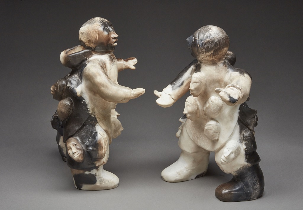 Familial relations are a common theme in Aupilardjuk’s work. In Two Friends Sharing Gossip (n.d.) the two figures are arranged in a convivial manner, standing towards each other and holding hands. Emerging from each figure’s parka are human faces turned at different angles and made up of different sizes. Through both the title and the work itself Aupilardjuk has created a fantastical narrative. It appears as though all the friends and family members the pair is discussing are present, aware and rising to the surface to join the conversation. All of Aupilardjuk’s works are similarly evocative and imaginative and seem to remind viewers that we bring our family or relations with us wherever we go.