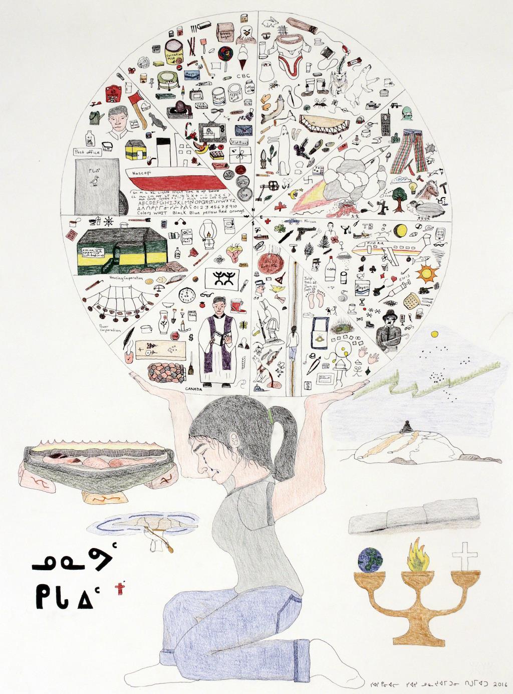 Kenneally began drawing in 2004 at the Kinngait Studios, where she frequently composed finely detailed prints and drawings in coloured pencil, ink and crayon [1]. Her work drew upon the material culture of the North as well as her memories, in particular, those from her childhood on the land. Her representation of traditional objects was partly influenced by learning to hunt and live off the land at a young age. Kenneally also spoke about how the lessons learned from her father concerning the balance between humans, animals and the land deeply informed her practice [2].