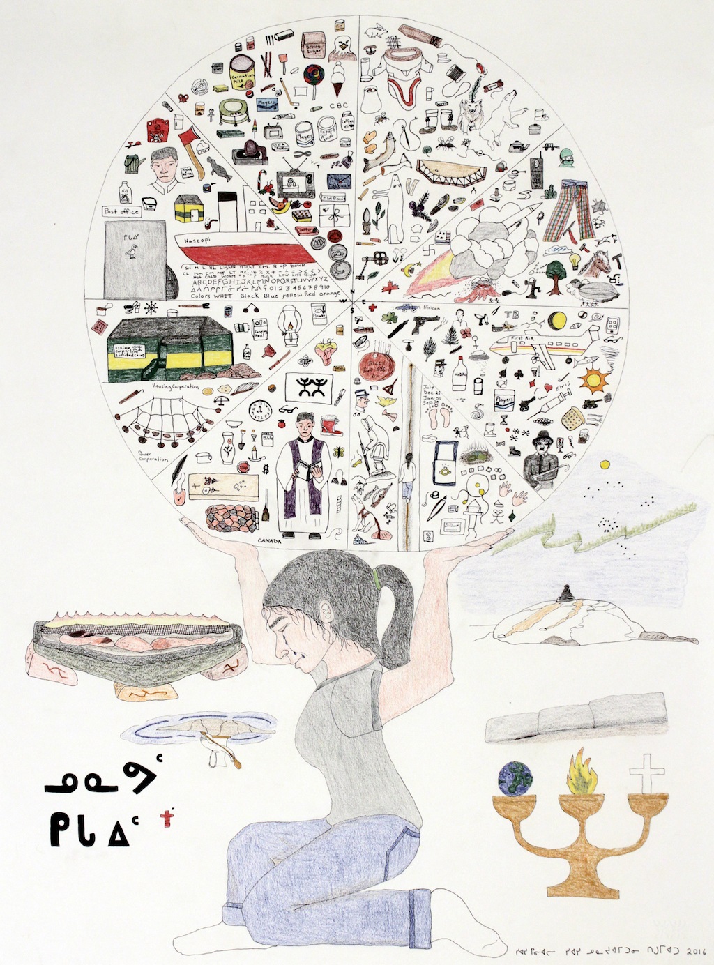 Kenneally’s works have been featured in several exhibitions and at multiple institutions throughout Canada and the United States, including the Art Gallery of Alberta in Edmonton, AB and the McMichael Canadain Art Collection in Kleinburg, ON. Her solo exhibition All the Things That I Have Seen (2017) took place at Feheley Fine Arts in Toronto, ON. The exhibition included a large drawing of the same name, completed in 2016 after the death of her son, depicting Kenneally as an atlas-like figure supporting a segmented globe populated with the material objects that literally and figuratively comprised her world [3]. Kenneally’s work is currently held in the collections of the Canadian Museum of History in Gatineau, QC and the National Gallery of Canada in Ottawa, ON.