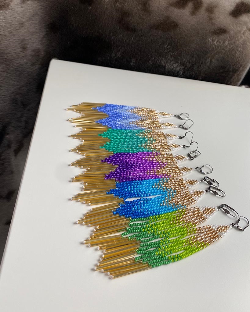 Beadwork is the latest skill Takpannie has added to her repertoire, creating fringe earrings and collar necklaces that combine vivid colours and metallics with bright neutral tones. Her aim is to create jewellery that “makes somebody who wears it feel good about themselves.” Her most recent collection of earrings included white and gold geometric shapes that fade into bright blues, greens and purple, finished with extra long gold bugle beads. Takpannie explains her artistic practice as part of a healing process: “[When I first started] I needed to create to survive. And now I create to relieve stress and ground myself.” [1]